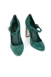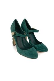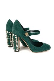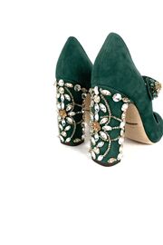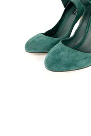 Туфли замшевые изумрудного цвета с декором на каблуке и пряжкой