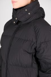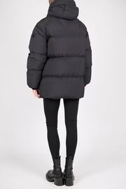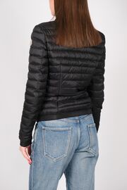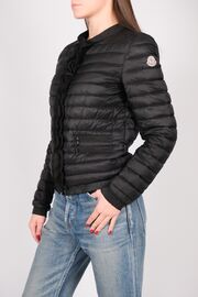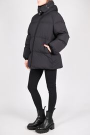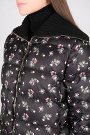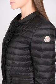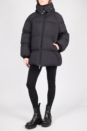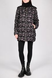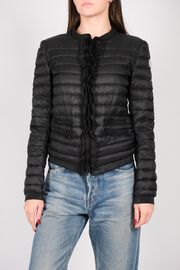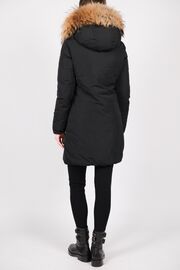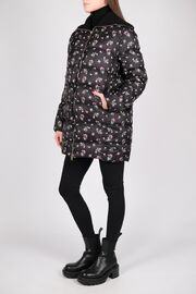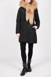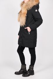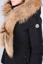 Короткий пуховик фиолетового цвета с мехом на капюшоне