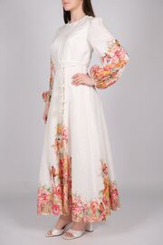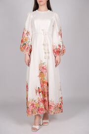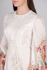 Льняное платье молочного цвета с длинным рукавом и принтом