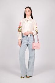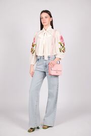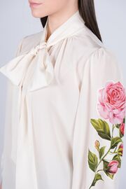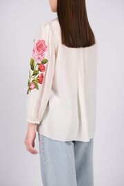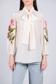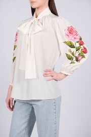 Шелковая блуза молочного цвета с розами на рукавах